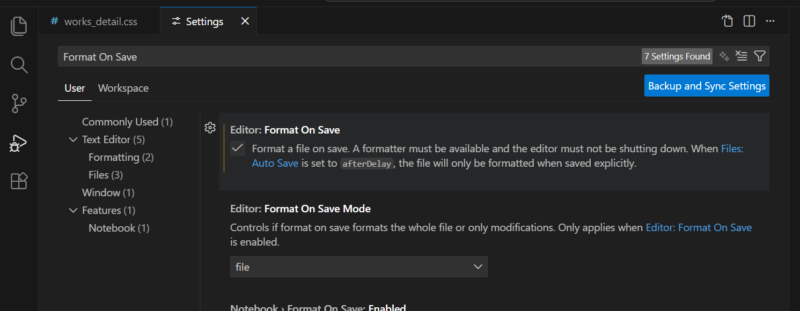 表示された画面に検索窓があると思いますので、「Format On Save」と入力し、「Editor: Format On Save」にチェックを入れたら完了です。